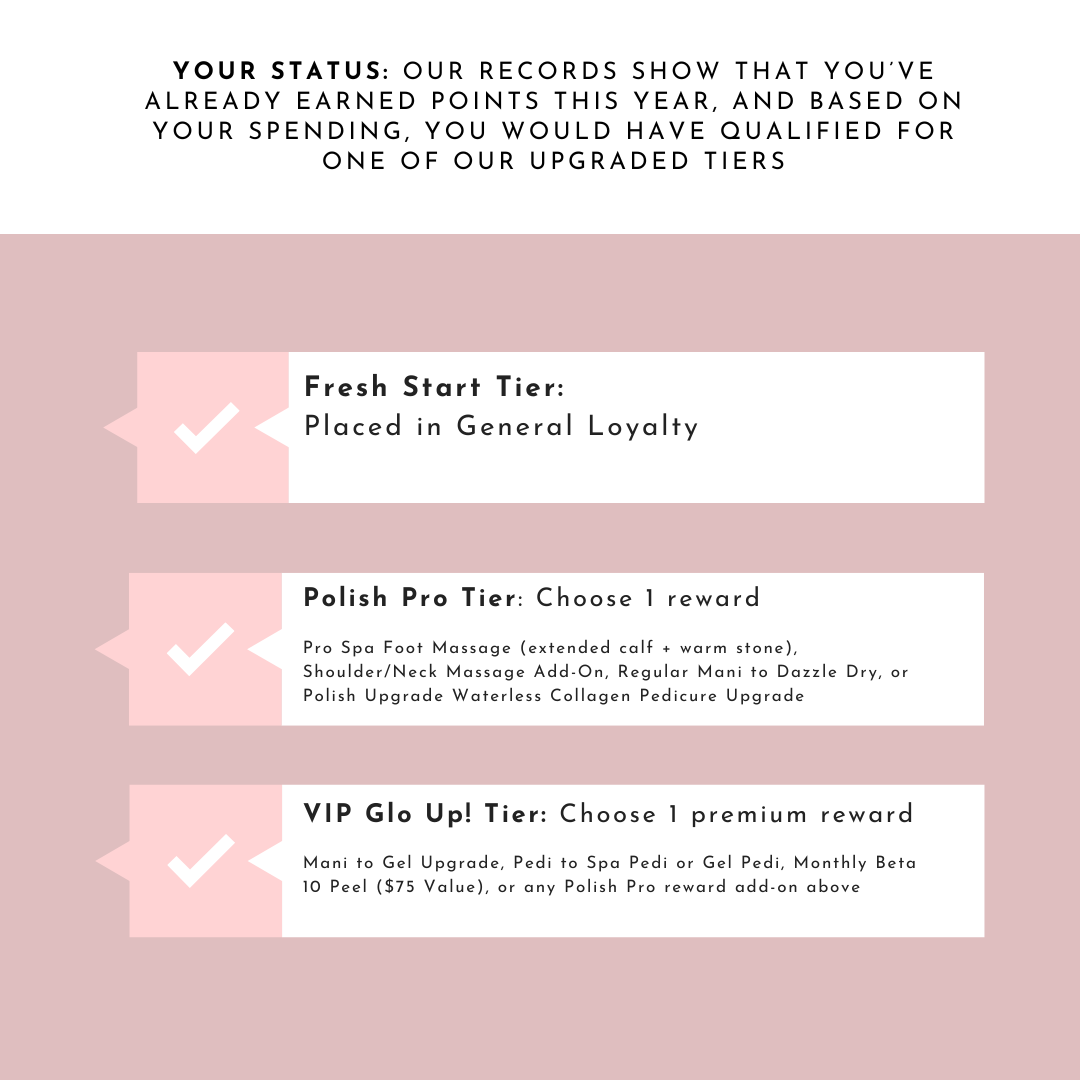 Treat Yourself for Being Loyal. Welcome to our new loyalty program where self-care earns you serious rewards. Whether you’re a mani-regular or a spa-day hero, there’s something for you in every tier.
