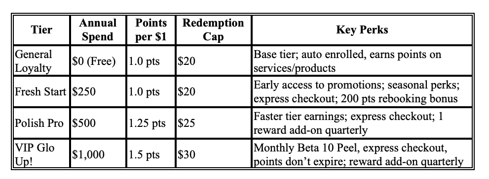 Tiers are granted based on annual spend OR points earned (e.g., 2,500 pts = Polish Pro)